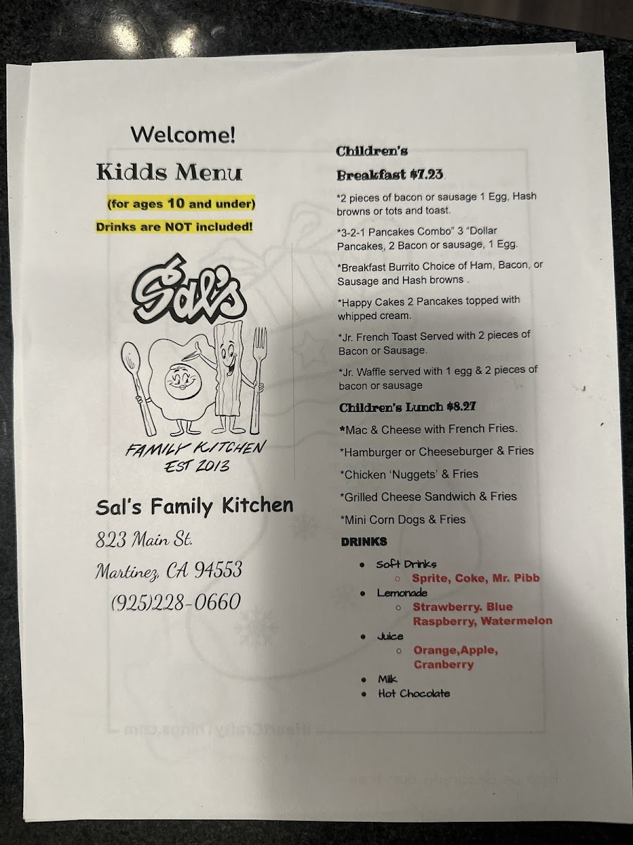 Sal's Family Kitchen offers a straightforward American café menu designed around comfort and familiarity. The dishes are perfect for those seeking hearty breakfasts or casual daytime meals in a cozy, unpretentious setting. Whether starting the day with a flavorful breakfast burrito or enjoying a plate of classic eggs and hashbrowns, the menu reflects a focus on satisfying, well-prepared classics that complement the warm, homey atmosphere.